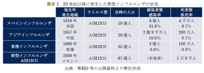 2009年に発生した豚由来のインフルエンザA(H1N1)など、新型インフルエンザは過去にも度々発生し流行している(表1参照)。いずれのインフルエンザも約2年に亘って流行し、そのうち感染のピークが2~3回発生している。
