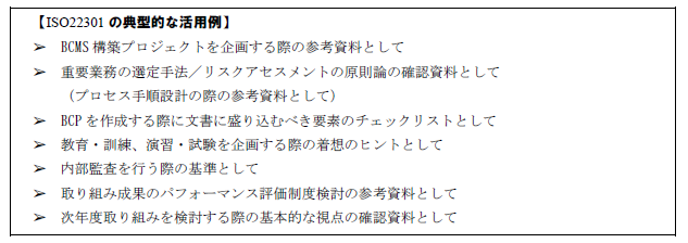 では、企業はISO22301に関心がないのかというと必ずしもそうではない。あえて認証取得まではしないが、一方でBCMSの構築・運用の場面において参考資料としてISO22301を活用するという企業が少なからずある。従来は、主要な枠組みを理解し経営陣を巻き込んでBCMに取り組む先進企業であっても、規格を意識している事務局は稀であった。しかし、最近の弊社への問い合わせでは、現にISO22301の内容を踏まえたご相談が増加している。ISO22301の典型的な活用例としては、次のようなものがある。