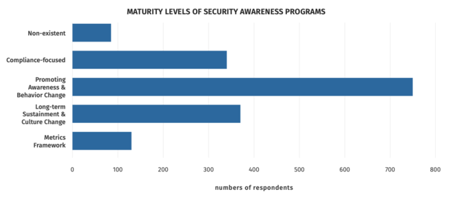 まず図1は、自組織のセキュリティ意識向上プログラムがどのような状況かを、SANS Instituteが定義しているプログラムの成熟度(maturity)の中で、どのくらいのレベルにあるかを尋ねた結果である。