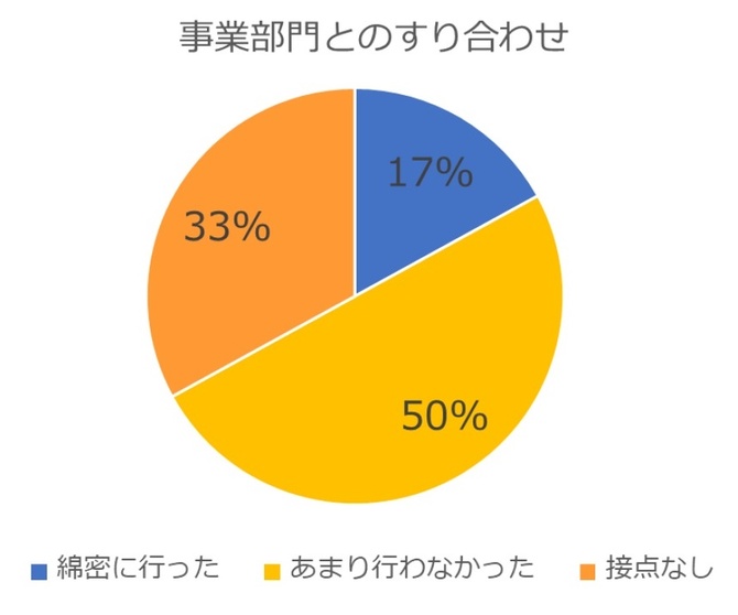 回答は(1)が17%、(2)が50%、(3)が33%という結果で、事業部門とのすり合わせがあまり行われていないことがわかりました。