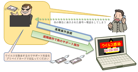 表示された電話番号に連絡すると、「遠隔操作でパソコンを直す」などとサポートと称し、遠隔操作ソフトをインストールさせられ、有料のサポート契約等を強いられ、電子マネーカードでの支払いやネット銀行での送金を求められます。