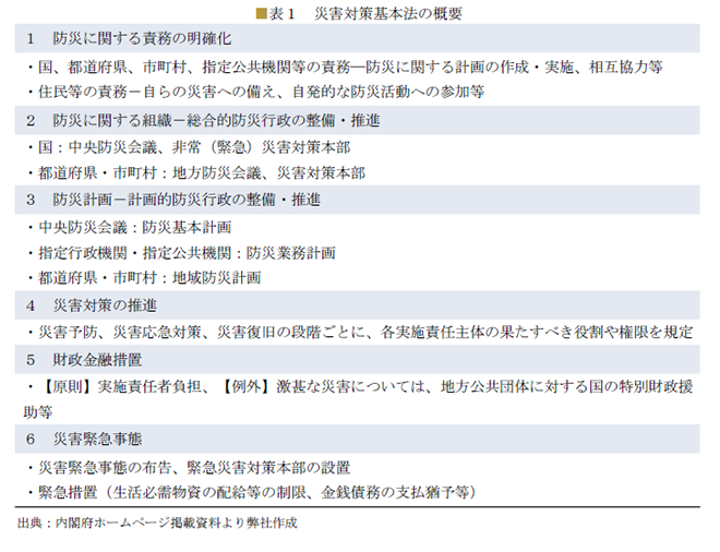 災害対策基本法は、1959年の伊勢湾台風を契機として、1960年に制定された法律である。国民の生命、身体及び財産を災害から保護することにより、社会の秩序の維持と公共の福祉の確保に資することを目的としており、災害対策の体系、防災行政の計画等を定める災害関連法制の基本法である。具体的には、以下の表1に示すような事項を定めている。