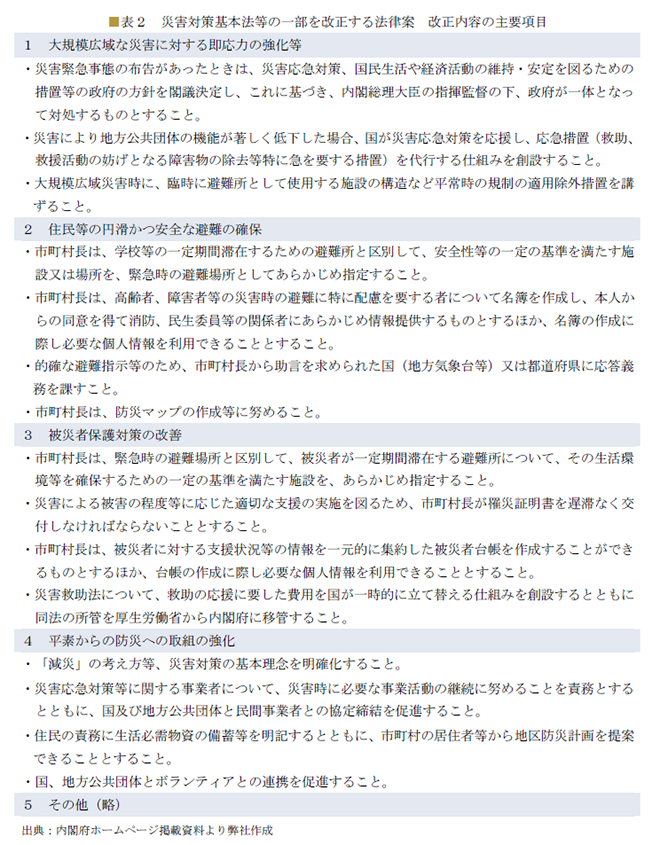 このうち、以下のような緊急を要するものについては、同年6月に公布・施行された災害対策基本法の改正(「第1弾」)で対処された。