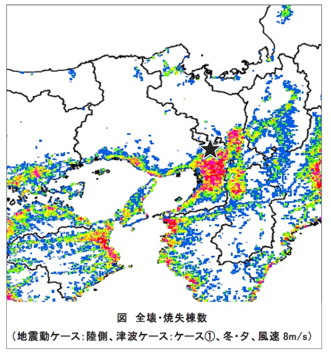 この事例の舞台となった場所に★をつけてあります。★印の南側を中心に、赤色(1キロ四方で500棟以上が全壊・焼失)や紫色(同200棟~500棟が全壊・焼失)の全壊・焼失地域が大きく広がっていることがわかります。また、全壊・焼失が多い地域が人口密度の高い地域と重なっていることもわかります。