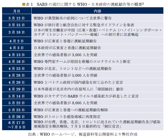 また表1は、2003年3月12日にWHOが原因不明の肺炎について警告を発してから、7月5日に「制圧宣言」を行うまでのWHO及び日本政府が発出した渡航勧告等の概要である。