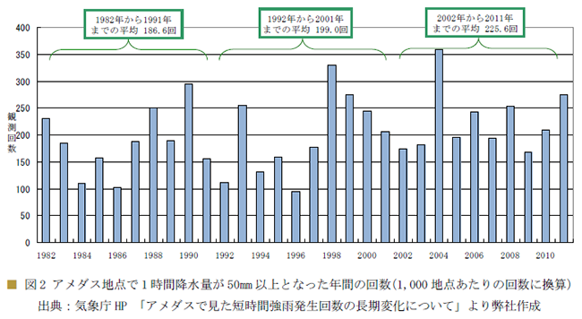 地球温暖化による降水量への影響に関する研究は、国土交通省、気象庁、文部科学省などで広く行われており、日本における大雨の発生数の増加傾向には、地球温暖化が影響している可能性が指摘されている。今後、地球温暖化が進行した場合には、大雨の発生数も増加すると予測されている(図1)また、。1時間の降水量が50mm以上の短時間強雨の発生回数も増加する傾向にある(図2)。このように、将来の気候変動の予測、過去の降水量データの分析のいずれも、大雨や集中豪雨の発生頻度が高まることを示唆している。