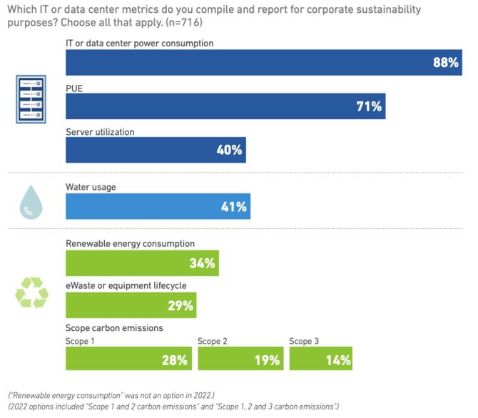 図1は「Sustainability and metrics」のセクションに掲載されているもので、ITやデータセンターの運営において、企業のサステイナビリティに関する報告のために、どのような測定値を使っているかを尋ねた結果である。最も多いのは電力消費量(IT or data center power consumption)、次いで電力使用効率(PUE : power usage effectiveness)、水の使用量(Water usage)、これとほぼ同率でサーバー稼働率(Server utilization)となっている。