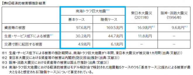 南海トラフ巨大地震と東日本大震、災阪神淡路大震災での経済的な被害の比較を表6に示す。