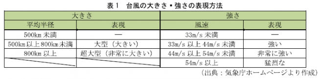 台風の大きさは中心から風速15m/s以上の風が吹くおそれがある距離で、強さは最大風速の大きさで表している。表1に表現方法を示す。