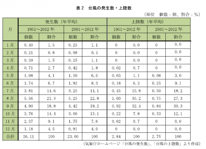 2001年~2012年の最近12年間では、年平均23個発生しており、台風の発生個数はやや減少しているとみられる。月別ではいずれの期間でも8月をピークとして、9、7、10月と続き、年間発生数の約70%が7月から10月に発生している。日本への上陸数でも発生数と同様に8月が最多であり、以下9、7、10月と続いている。台風の月別発生数・上陸数を表2に示す。