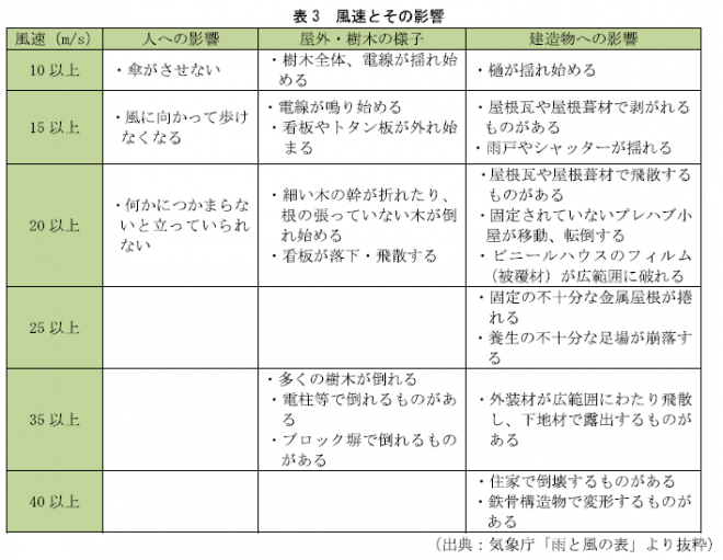 台風の東側では南、南側では西、西側では北、北側では東からの風が吹き、台風の進行と位置関係により、その地点の風向は変化する。風速とその影響について、表3に示す。