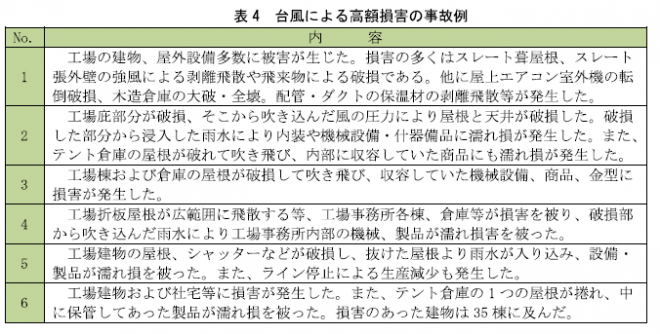 台風による損害の多くは、風によるものであるが、風による建物の損害に伴い、破損個所からの雨水の吹き込みによる収容物の損害もみられる。台風による高額(1億円以上)な損害となった事故例を表4に示す。