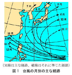 台風は、春先は低緯度で発生し、西に進んでフィリピン方面に向かうが、夏になると発生する緯度が高くなり、図1のように太平洋
