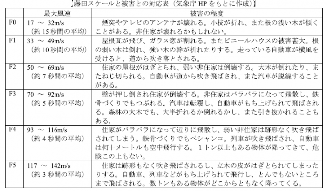 1971年にシカゴ大学の藤田哲也博士により考案された、竜巻やダウンバーストなどの突風により発生した被害の状況から風速を大まかに推定する風速のスケールである。被害が大きいほどFの値が大きく、風速が大きかったことを示す。気象庁によれば、日本ではこれまでF4以上の竜巻は観測されていない。