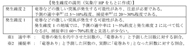 降水や雷とは異なり、竜巻などの突風はレーダーなどの観測機器で実体を捕らえることができないため、竜巻発生確度ナウキャストでは「発生確度」という言葉を用いて「竜巻が今にも発生する(または発生している)可能性の程度」を示す。発生確度1のエリアでは竜巻の発生する可能性は1~5%程度、発生確度2のエリアでは竜巻の発生する可能性は5~10%となっている