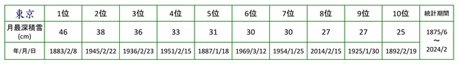 表1に、東京における積雪深の歴代順位1~10位の記録を示す。トップ10のうち、6事例が2月に記録されており、1月が3事例、3月が1事例である。
