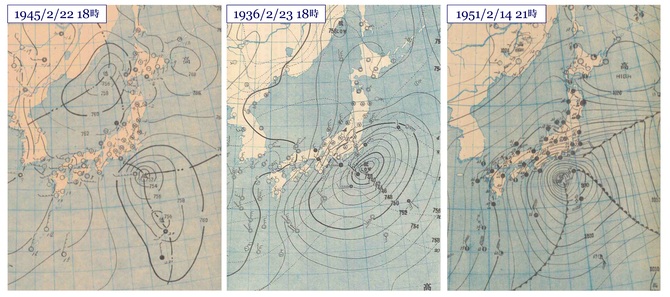 東京の積雪深の歴代3位は、1936(昭和11)年2月23日に記録された36センチメートルである。当日の天気図を図1(中)に掲げる。八丈島近海に中心気圧736ミリメートル水銀柱(換算すると約981ヘクトパスカル)の低気圧があり、東北東へ進んでいる。この低気圧は北東~南西走向の長軸を有するいびつな形をしており、北側の降雪域が広く東北地方まで及んでいることから、中心から北東方向に閉塞前線がのびていたのかもしれない(当時はまだ前線や閉塞の概念が定着していなかった)。北海道東部は高圧部になっている。この日には東京で43ミリメートルの降水があり、最高気温は摂氏1.6度、平均気温は摂氏0.0度であり、明け方から夜遅くまで雪が降り続き、降雪のピークは夕刻であった。そして、翌日には雪が止んだが、3日後の26日には再び南岸低気圧が現れて降雪があり、有名な二・二六事件が起こった。