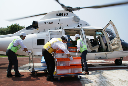 日清医療食品は9月13日、和歌山県でヘリコプターを使った被災地に向けた食材支援物資訓練を実施した。東海・東南海・南海3連動地震の際に甚大が被害が予想される地域に、緊急時、東京ヘリポートからヘリコプターを関西圏を管轄する支援物資倉庫(大阪府高槻市)付近の場外離着陸上まで飛行させ、物資を積み込み和歌山県田辺市の社会保険紀南病院に運び、そこを拠点として被害が甚大と想定される海岸地区にある特定医療法人洗心会玉置病院へ物資を搬送するというもの。