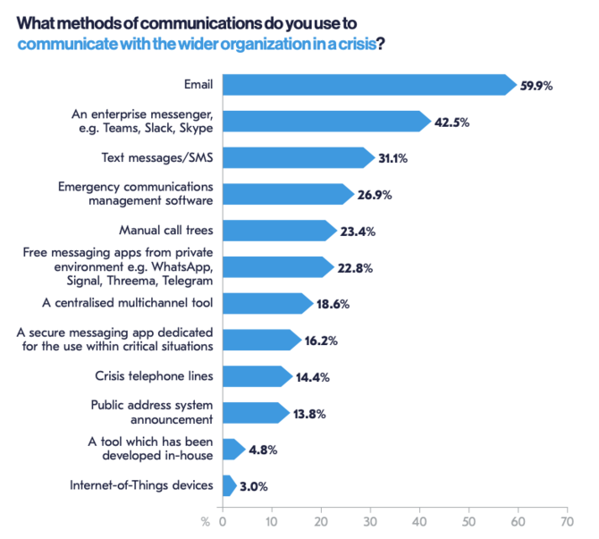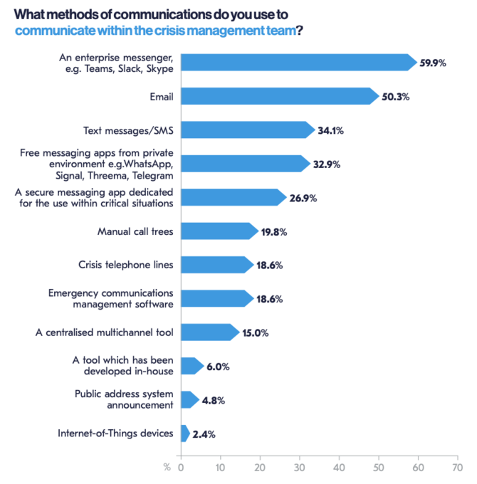 図1は緊急事態対応において、危機管理チームの間で使用するコミュニケーション手段について尋ねた結果である。昨年3月に紹介させていただいた2023年版でも似たようなデータがあったが、2023年版では設問の後半が「to communicate internally during a crisis?」(危機的状況下における組織内部でのコミュニケーションに)となっていたのに対して、今回は「within the crisis management team?」(危機管理チームの間で)というように、対象を危機管理チームに限定している。