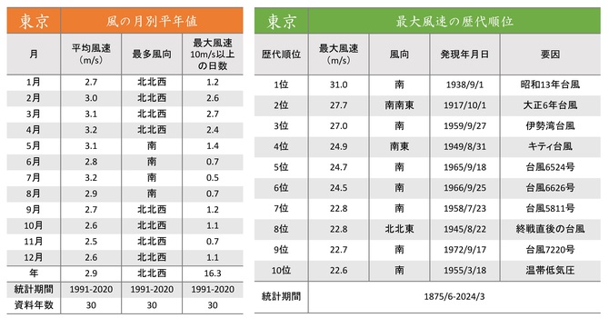 表1に、東京の風に関する月別平年値を示す。月平均風速は、冬(12・1・2月)より夏(6・7・8月)の方が強くなっている。月平均風速が最も強いのは4月と7月で、どちらも3.2メートル/秒である。ただし、この両月は最多風向が異なり、4月は北北西、7月は南が最多である。4月は冬の季節風のなごりの北北西風が優勢であり、7月は夏の季節風に海陸風現象の海風の要素が加わって南風が優勢になる。