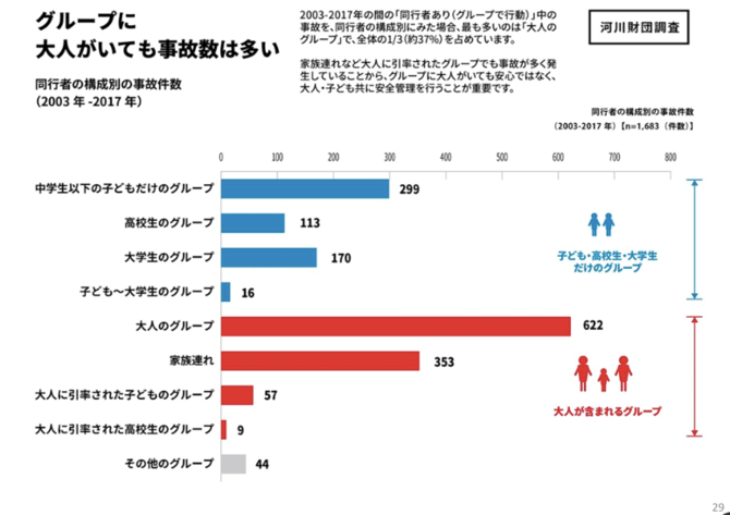 事故件数で最も多いのは、こどものグループではありません。「大人だけのグループ」が全体の3分の1を占めます。そして、次に多いのが「家族連れ」です。