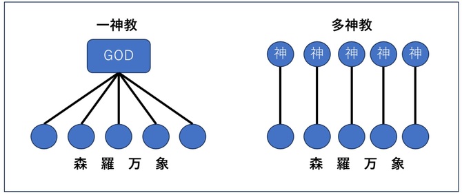一神教では森羅万象あらゆるものに神は遍在し、その神は唯一絶対神(従って大文字のGODという固有名詞として表現)である。一方、多神教では、自然界のあらゆるものにそれぞれ神のご加護が及ぶという自然信仰が基盤になる。