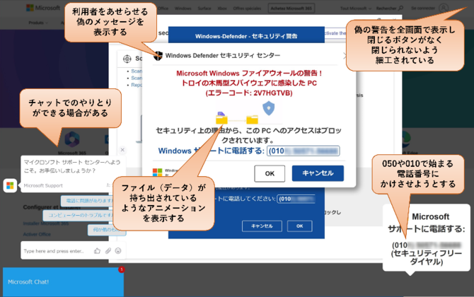警告画面には050から始まる電話番号や国際電話接続の010から始まる電話番号を表示させたり、ファイルやデータが持ち出されているようなアニメーションやチャット画面を表示させるなど、本物の警告やサポートであると信じさせるための細工がされています。