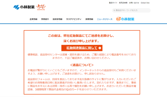 お客様をはじめ関係各位には、多大なるご迷惑をおかけしますことを深くお詫び申し上げます。本件については重大な事案と受け止めており、引き続き、調査を継続してまいります。(小林製薬 第1報 3月22日)