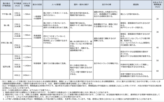 気象庁のこの表に詳しくありますが、風速30m/sくらいからトラックが横転するとあります。35m/sになると樹も倒れるし、ブロック塀まで倒れるんですって。ブロック塀が倒れるのは地震だけではないんですね・・・。