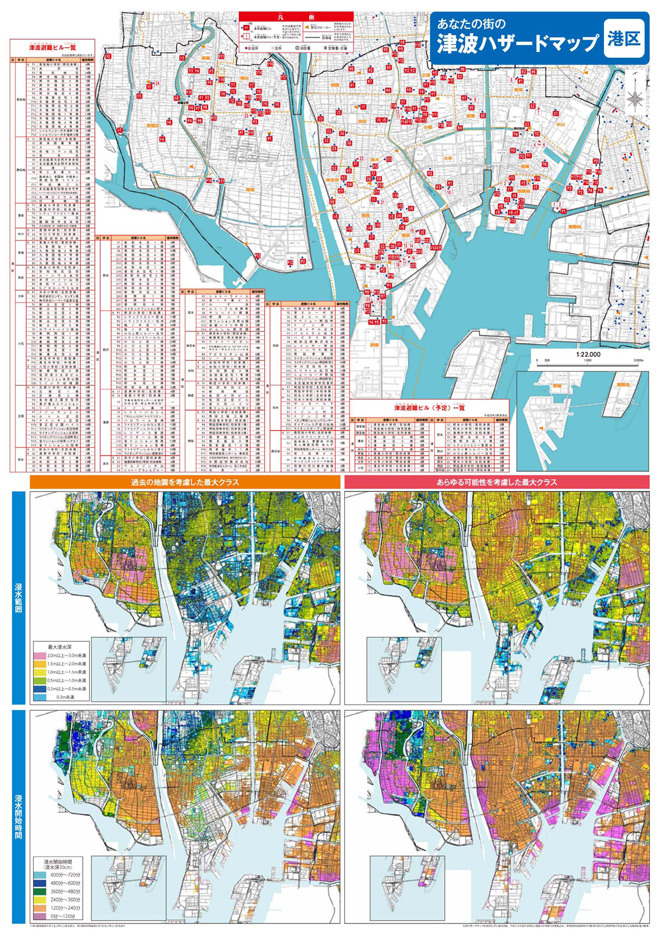 津波ハザードマップは津波が想定される海沿いの地域ごとに「中村・熱田・中川区版」「瑞穂・南・緑区版」「港区版」の3種類を作成した。浸水想定地域を含む学区の約30万世帯に配布する。2つのケースを想定した浸水範囲や、浸水深が30cmに達する浸水開始時間を色分けして示したほか、地図では津波避難ビルの一覧を掲載した。名古屋市で予想される津波は、同市が伊勢湾の奥に位置することから、東日本大震災と異なり白波が起きずに海面全体が上昇することが予想されている。裏面では予想される津波の特徴や海岸線ごとの津波の到達時間帯を記したほか、地震ハザードマップと同じく避難経路の確保や被災時の避難行動などについて詳述している。浸水深を記入するシールも合わせて配布する。津波の到達が予想されるオフィスや住居などに想定される浸水深を書き込み、日常的に見えるところに張ることで日ごろからの防災意識を高めてもらうのが狙い。