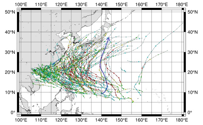 図1は、1951年以降の6月に発生したすべての台風の経路を、地図上に重ね書きしたものである。この図をどう見るか。