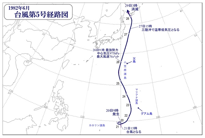 図3に、台風第8205号の経路図を示す。1982年6月20日9時にカロリン諸島で発生した熱帯低気圧は、発生位置付近の海上にしばらく停滞し、21日15時に台風第5号となった。その後、この台風は北東へ移動し始め、次第に針路を北に変え、22日にはグアム島の西を通過し、24日にかけてマリアナ諸島の西側を北上しながら徐々に発達した。24日から25日にかけては北北西に針路をとり、小笠原諸島の西側へ進んだ。25日21時以降は東進成分を持ち始めたが、北東へ向きを変えることはなく、北上成分の大きい動きを見せた。父島に最接近した26日9時頃がこの台風の最盛期で、生涯を通じて最強の最大風速(70ノット=約35メートル/秒)を伴った。27日になっても台風は北北東へほぼまっすぐ進み、27日15時に宮城県牡鹿半島の東約250キロメートルの三陸沖で温帯低気圧に変わり、その後は左カーブを切って北海道東部を縦断し、オホーツク海へ進んで消滅した。