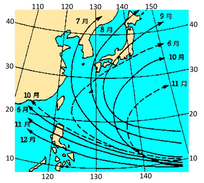 図2で、6月の副次的な台風経路として描かれている破線の経路に目を向ける。台湾の東の北緯22度付近に転向点を描いているのは、図1から見れば正しいと言える。転向点を過ぎた後の経路が本州南岸沿いに描かれ、上陸するものもあることを匂わせているのは、なかなか思わせぶりである。本連載の2021年11月(おくて台風)でも述べたが、図2は、誰がいつ描いたものか、不明である。