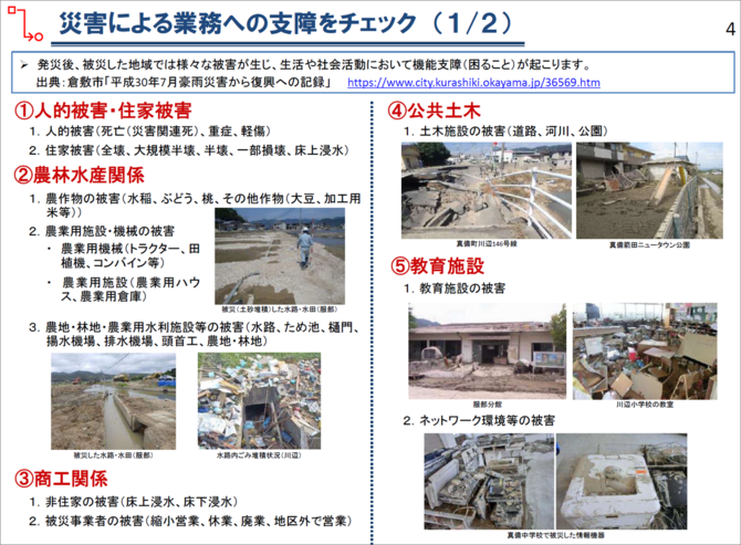ご紹介したウエブサイトには、「作成の手引き」を掲載しています。みなさんの職場やご自宅が浸水すると様々な支障(困りごと)が発生します。手引きの4・5ページには平成30年7月豪雨災害における被害の状況を掲載しましていますので参考にしてください。