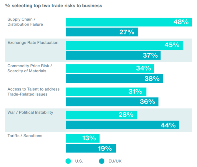 図1は取引に影響を及ぼすリスクの上位2つを尋ねた結果である。色が薄い方のバーが米国、濃い方のバーが欧州からの回答結果となっており、米国と欧州で差異があるのが興味深い。