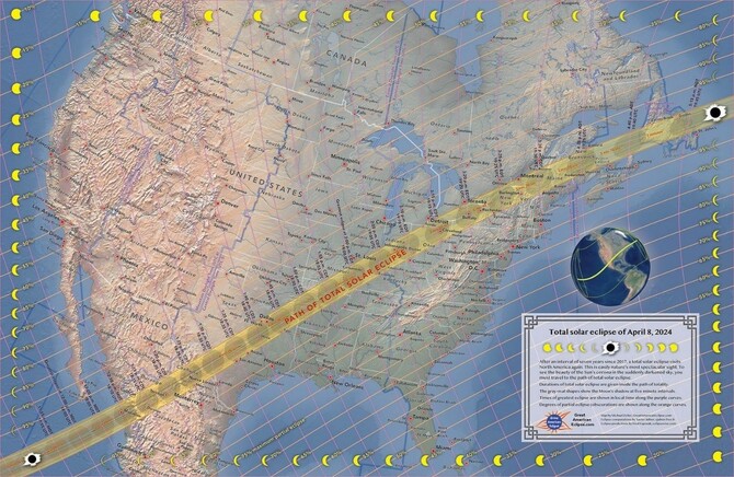 (メキシコからアメリカ合衆国の中東部、カナダ東部まで、皆既日食の中心帯が横断)