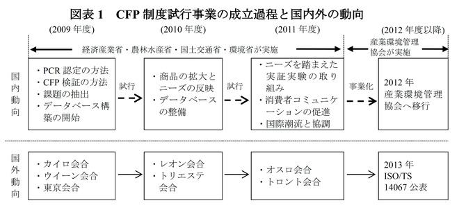 CFPプログラムは、産業環境管理協会が、国のCFP制度試行事業を引き継ぎ運営しています。CFP制度試行事業とは、経済産業省が中心となり、農林水産省、国土交通省、環境省が、2009年度から2011年度の3年間、試行事業として実施した基本的ルールの整備と実証実験です。CFP制度試行事業の成立過程と国内外の動向は、図表1のとおりです。