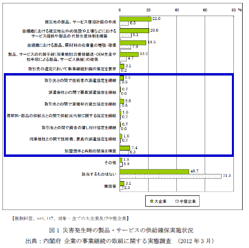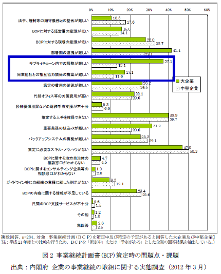 なお、内閣府の調査では、BCPに連携を取り入れようとするものの、「サプライチェーン内での調整が難しい」、「同業他社との相互協力関係の構築が難しい」といった結果がでている。(図2参照)