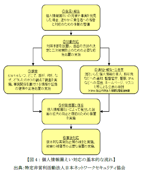 個人情報が漏えいした場合、一般的には以下のような手順に従って対応がなされる。漏えい事件の規模にもよるが、これらの対応は通常業務と並行して実施されるため、大企業においては大きな負荷が掛かるとともに、その対応費用も高額に上ると考えられる。
