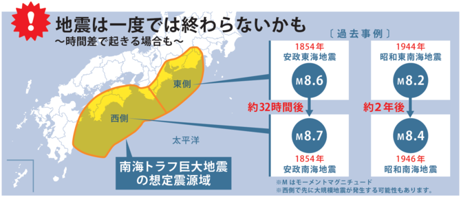 「南海トラフ地震臨時情報」で「巨大地震警戒」や「巨大地震注意」が発表された場合は、少なくとも発表から1週間は、後発地震に備えた防災行動が必要とされます。