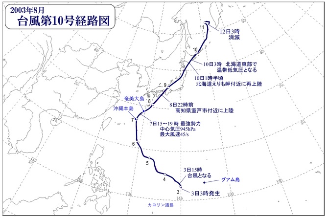 図1に、台風第0310号(2003年台風第10号)の経路図を示す。8月3日3時にグアム島の西海上で発生した熱帯低気圧は、3日15時に台風となった。この台風は、フィリピンの東海上を北西へ進みながら発達し、5日3時には中心付近の最大風速が35メートル/秒に達して強い勢力となり、6日以降は北北西に進んで、7日9時半頃沖縄本島付近を通過した。その後は北北東に向きを変え、奄美諸島に沿って進んだ7日15時から19時にかけて、中心気圧945ヘクトパスカル、中心付近の最大風速45メートル/秒に達して大型で非常に強い台風となり、生涯を通じての最強勢力を示した。台風はさらに北北東へ進み、8日22時前に高知県室戸市付近に上陸、9日6時頃兵庫県に再上陸した。台風はその後、勢力を弱めつつ、加速しながら、近畿北部、北陸、東北地方を経て、10日1時半頃、北海道えりも岬付近に三たび上陸し、10日3時に北海道東部で温帯低気圧に変わった。その後は、オホーツク海へ進み、12日3時にカムチャツカ半島の西の海上で生涯を閉じた。