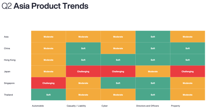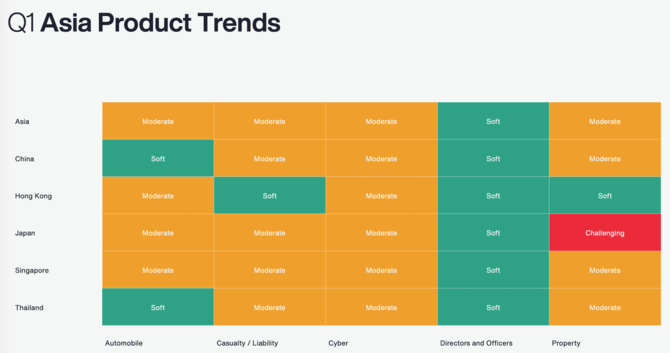 まず図1は、保険商品(product)ごとのトレンドを地域ごとにまとめて示したものである。ここで保険商品は図の下側に示されているように、自動車保険(automotive)、損害賠償責任保険(casualty / liability)、サイバー保険(cyber)、役員賠償責任保険(directors and officers)、財物保険(property)に分けられており、市場における状況が色分けで示されている。