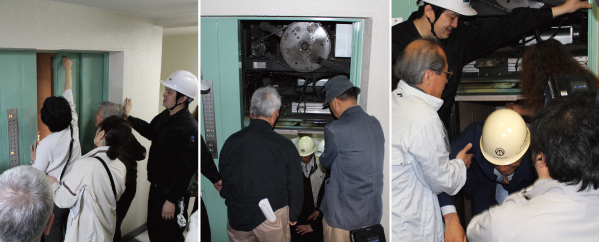 訓練は、まず同社の指導のもとマンション住民がエレベーターの電源を切ることから始まる。停電時でも救助活動中に電気が復旧するとエレベーターが突然動き出す可能性があり、作業中の事故原因となる恐れもあるからだ。電源を切ったことが確認できたら、エレベーターの扉のカギを開ける人、扉を開く人、二人を支える人の3人1組となり、安全を確認しながらエレベーターの扉を開く。エレベーターが階の途中で止まっていることも考えられるので、脚立などを用意して中にいる人を救助する。マンションによって電源や鍵の位置などは変わるので、専門家や管理組合と協働した事前準備が重要だ。ある程度の閉じ込めを予想したエレベーター用の簡易備蓄キットを設置することも有効だという。