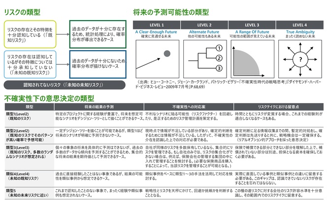 企業が直面するリスクは、これまでの実務経験の中で、リスクの特質を把握でき、その特徴を定量化できているものと、未知の要素が強くリスクの特性を十分把握できていないものに分けることができる。未知の要素の介在が大きいほどその結果は不透明にある。それゆえ、実務において不確実性の予測可能性の度合いを意識した対応が重要となる。これまでもこの視点から意思決定を類型化する取り組みは行われてきた。その考え方を整理し、類型ごとにおける留意点を例示してみたので、参考としていただきたい(図表-2)。