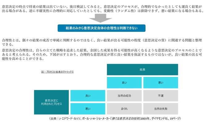 意思決定の合理性は結果で判断できるものではない。その人がどういうプロセスと論理を用いて意思決定したかによって判断されるものである。なぜなら、物事の結果には意思決定者が直接コントロールできること以外にもさまざまな要因が介在しており※1 、たとえ十分合理的な対応をしたとしても、コントロール外の要素によって結果は影響を受け、意思決定プロセスの合理性に直接帰する問題とは言い難いからである(図表―1参照)。
