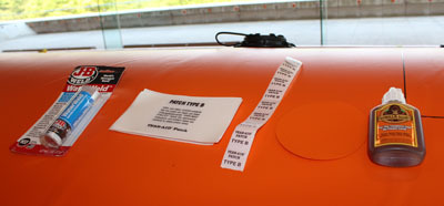 Q. しかし、土のうは安くて手軽に購入できます。それは単なる神話だ。確かに袋そのものは安い。しかし、袋に土砂を詰める人件費や運搬費、処分費まで考えれば、とても高い買い物と言っていい。その点、タイガーダムは何度も繰り返し使えるため、使えば使うほどコストメリットを出すことができ、結果、はるかに費用が抑えられる。穴があいたり破れたとしても、タイヤのパンク修理のように手軽に修理して使うことができる(写真右)。これから洪水被害が増えることを考えれば、毎年、土のうのために予算を積み上げるのはナンセンスだ。