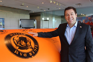「土のう」に代わる洪水対策製品としてカナダの浸水対策商品「タイガーダム」が注目を集めている。太く頑丈なチューブに、水を急速注入することで「水のう」を作り、洪水などの浸水を防ぐというもの。太さや長さが自由に設計でき、太さは直径60センチから技術的には最大8メートルまで、長さも数メートルのものから数キロまでニーズや設置環境に応じて設置することが可能だ。従来の土のうは、安価な半面、土砂を詰めて運搬して設置するなど、手間や時間がかかり、使用後の土砂や袋の処分についても課題があった。タイガーダムは、短時間で設置できることが最大の特長で、17年間という長期間にわたり使い続けられる耐久性を併せ持つ。大手保険会社FM Global(米ロードアイランド州ジョンストン)による防災認証「FM認定」取得を受け、北米を中心に導入が進んでいる。2013年に米ニューヨークなどを襲ったハリケーンサンディでは、電力会社や金融機関、保険会社らが、浸水対策として採用し、日本でも、自治体、企業を中心に同製品を活用する組織が増えている。開発メーカーのInternational Flood Control社のポール・ヴィッカーズ社長に聞いた。