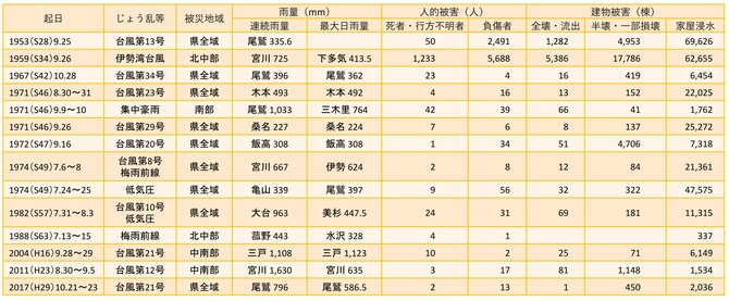 表2は、三重県でこれまでに発生した主な水害の一覧表で、三重県のホームページ掲載の資料に基づいている。人的被害に着目すれば、1959(昭和34)年の伊勢湾台風による被害が圧倒的に大きいのだが、これは主に高潮災害である。降水量に着目すれば、本稿で扱う2004(平成16)年9月の豪雨や、本連載で2022年9月にとりあげた2011(平成23)年9月のいわゆる「紀伊半島大水害」が顕著なものである。ちなみに、表2に記入されている「連続雨量」は、河川関係者が用いる用語で、気象で用いる「積算雨量」に似ているが、無降水期間があるとそこでクリアするしくみになっている。以下、本稿では、2004年9月28日~29日の三重県における豪雨を「三重県豪雨」と呼ぶ。