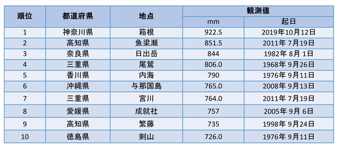 三重県と言えば、わが国有数の多雨地域で、降水量のランキングの上位に必ず登場する。たとえば、気象庁の日降水量ランキング(表1)では、第1位が箱根(神奈川県)の922.5ミリメートルで、以下、第2位が魚梁瀬(やなせ、高知県)、第3位が日出岳(ひでがだけ、奈良県)と続き、第4位に尾鷲(おわせ、三重県)の806ミリメートルが出てくる。第7位にも宮川(みやがわ、三重県)の764ミリメートルという記録が並んでいる。このような地域は雨に強く、大雨が降っても大きな災害にはつながりにくい傾向があるが、2004年9月ほどの豪雨になるとさすがに耐え切れず、重大な災害の発生に至ってしまった。
