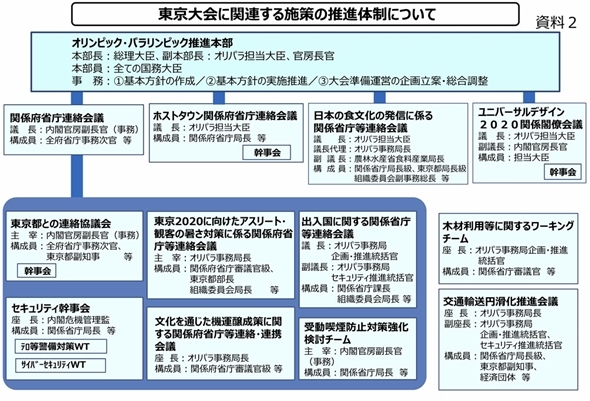 政府(国)の基本的な役割は、大会の支援調整です。政府には、総理を本部長として大臣級で構成される「オリンピック・パラリンピック推進本部」が置かれています。オリンピック・パラリンピックに関する全ての施策がこの本部の下で進められ、多くの会議が連なっています。例えば、選手の練習場所などを提供するホストタウンの関係府省庁連絡会議、オリンピック・パラリンピックに合わせて日本の食文化を発信する「日本の食文化に係る関係府省庁等連絡会議」、障がい者の方のためにユニバーサルデザインの普及を進める「ユニバーサルデザイン2020関係閣僚会議」、外国人観客などの暑さ対策のための「東京2020に向けたアスリート・観客の暑さ対策に係る関係府省庁等連絡会議」、選手と大会関係者や外国人観光客の「出入国に関する関係省庁等連絡会議」などが置かれています。これらの会議からもお分かりのように、国の基本的役割は、オリンピック・パラリンピックを運営する組織委員会や関係者を支援調整することです。